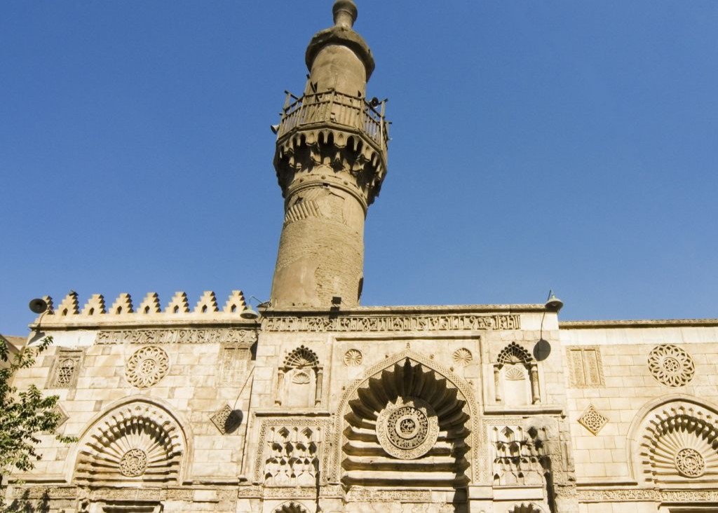 Al Mustafa Mosque in Egypt boasts two 72m minarets and a large dome. The interior features carved marble and smaller domes, illuminated at night.