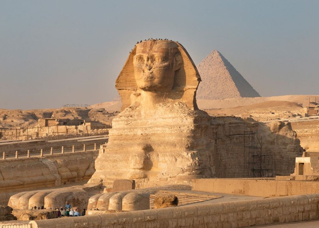 The Sphinx of Giza is a limestone statue of a reclining lion with a human head.