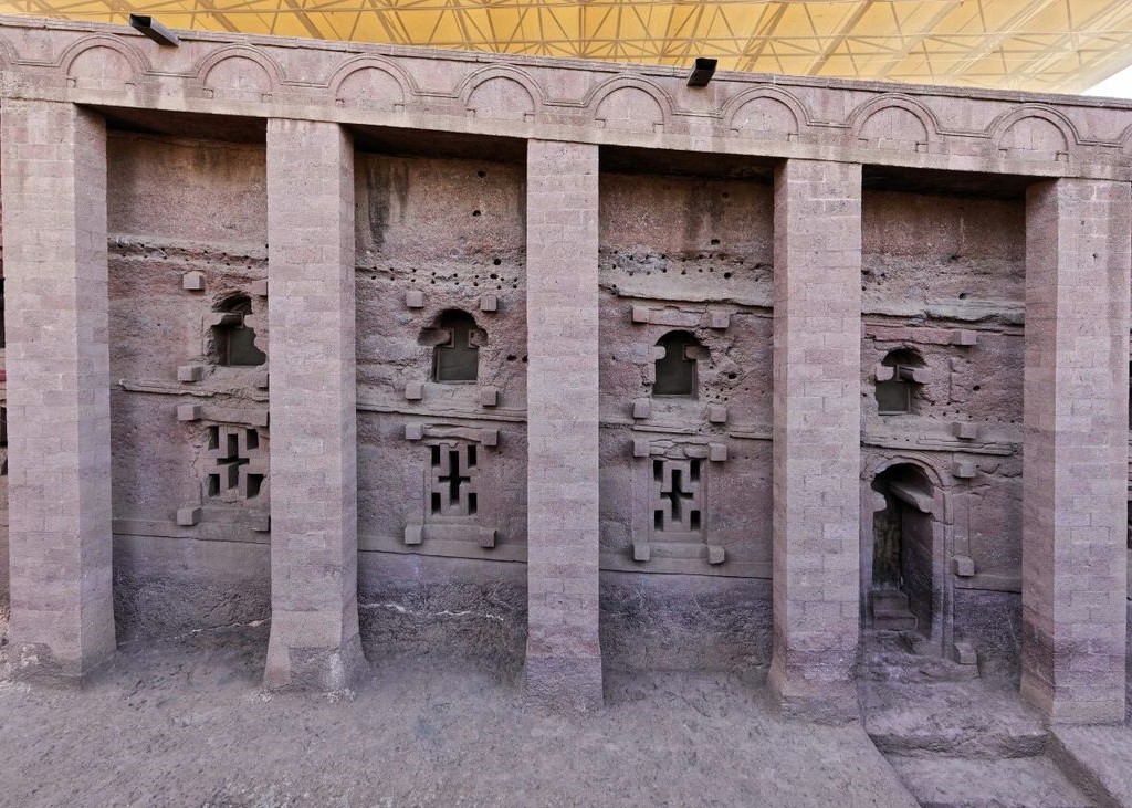 Medhane Alem in Lalibela is a UNESCO-protected rock-cut church from the Axumite period and houses the Lalibela Cross.