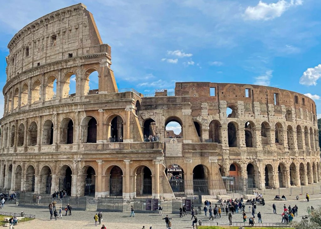 Rome's Colosseum is a large oval amphitheater made of travertine, tuff, and brick-faced concrete. It is the largest ever built.